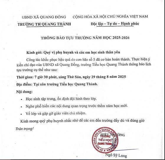 THÔNG BÁO TỰU TRƯỜNG NĂM HỌC 2025 - 2026
